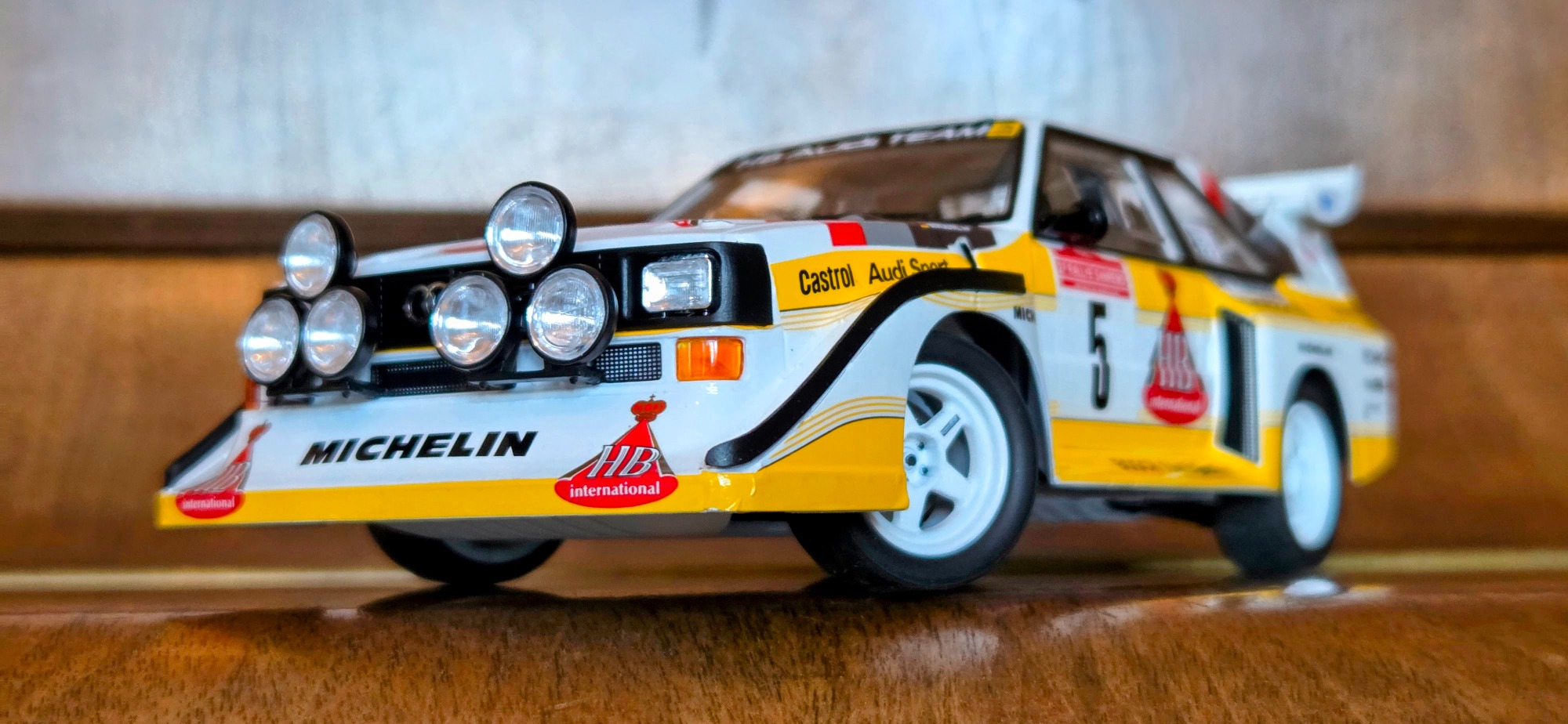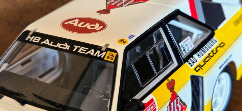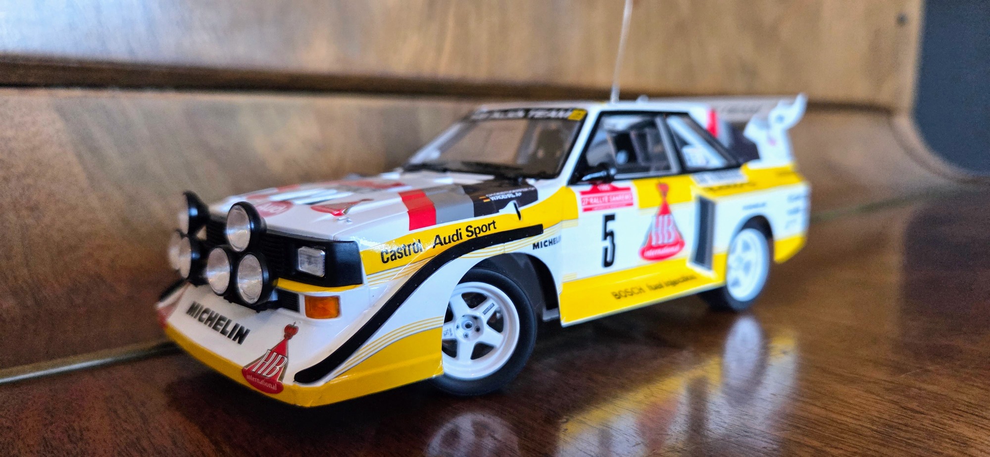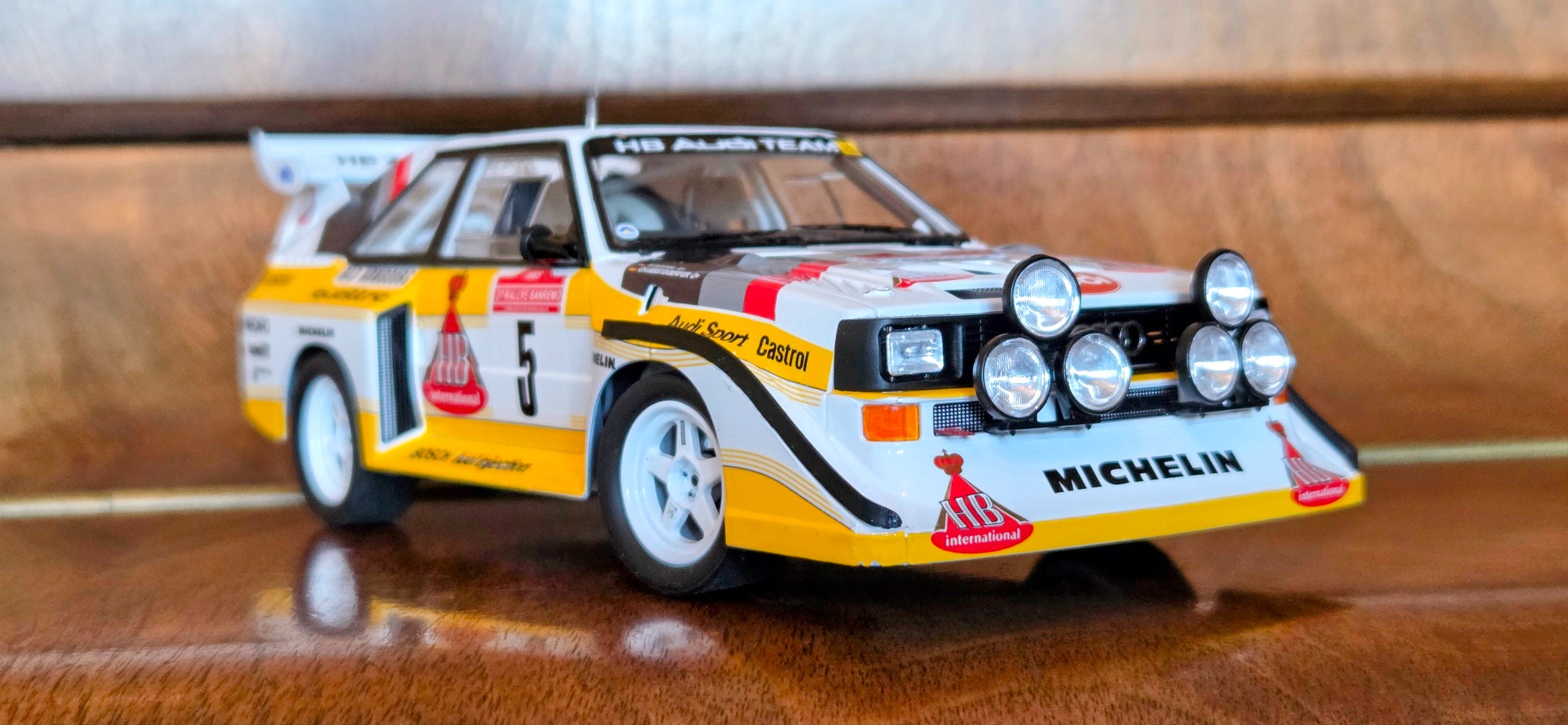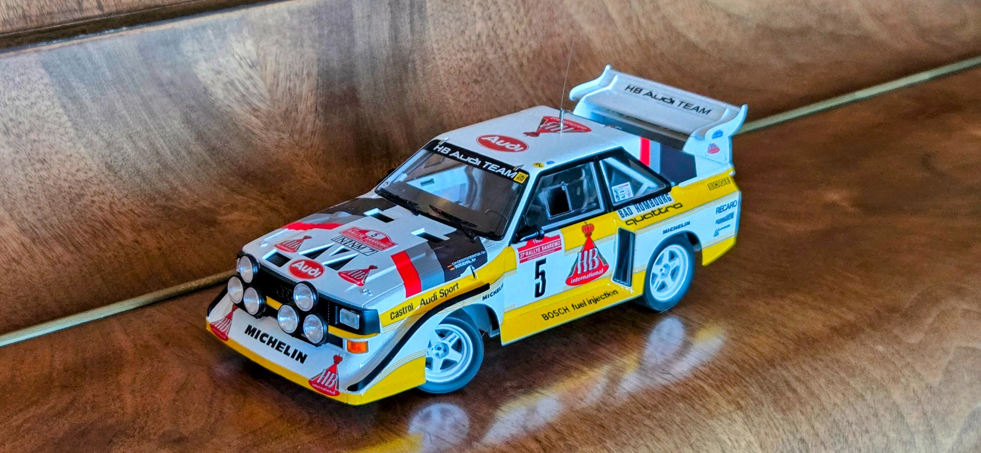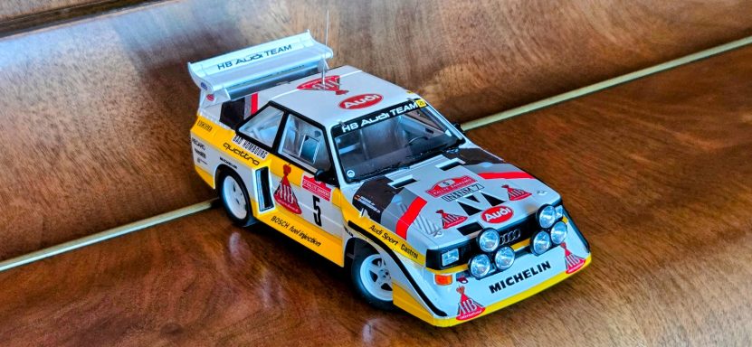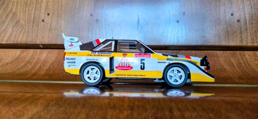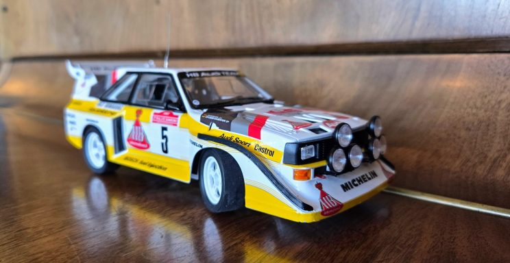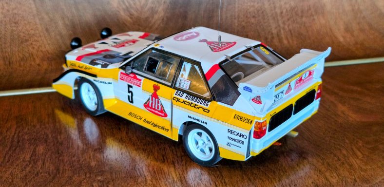 Driven by Walter Röhrl and Christian Geistdörfer as car No. 5 on the 1985 Rallye Sanremo, this finished 1/24 scale build represents the Audi Sport quattro S1 E2 in its late-Group B specification. The model has been enhanced with an additional photo-etched detail set to sharpen exterior and cockpit definition beyond the standard kit.