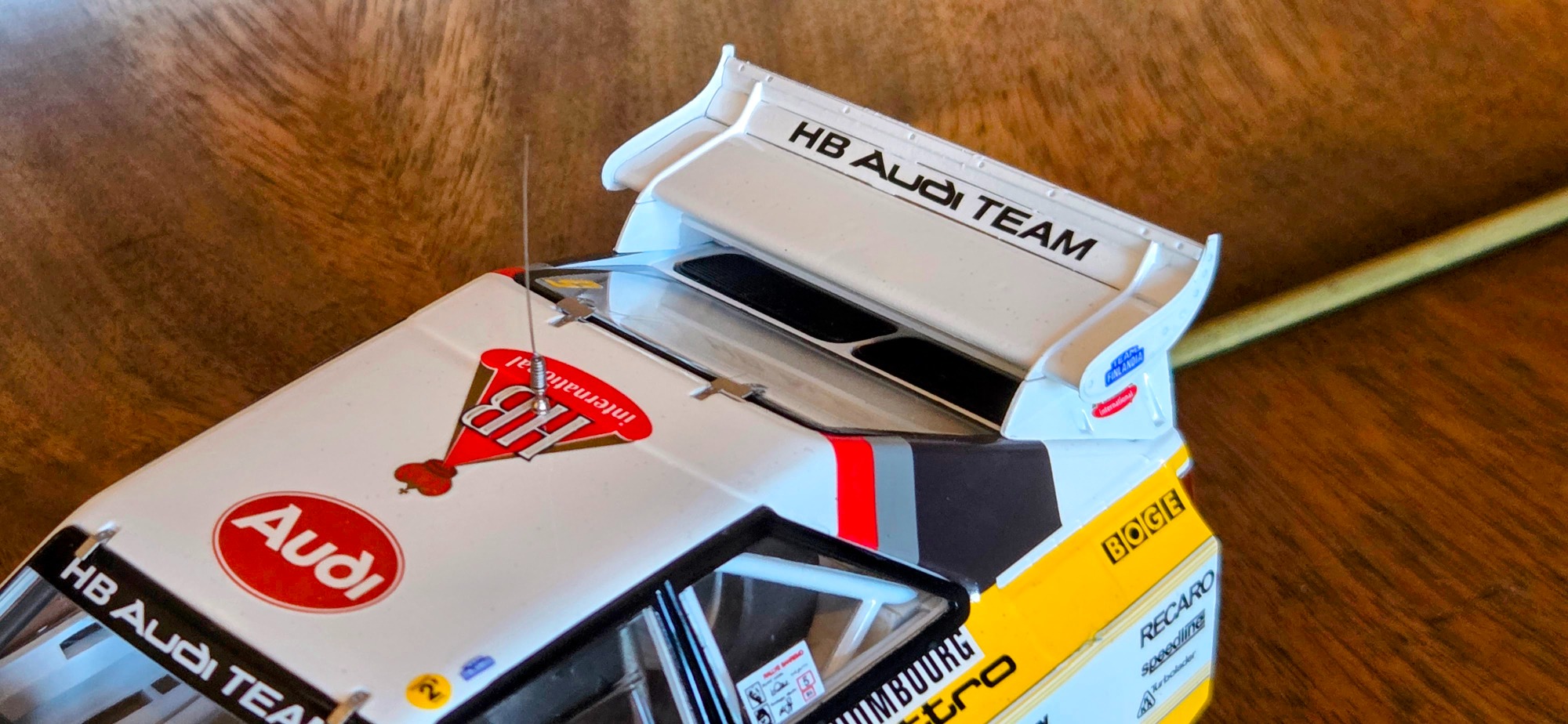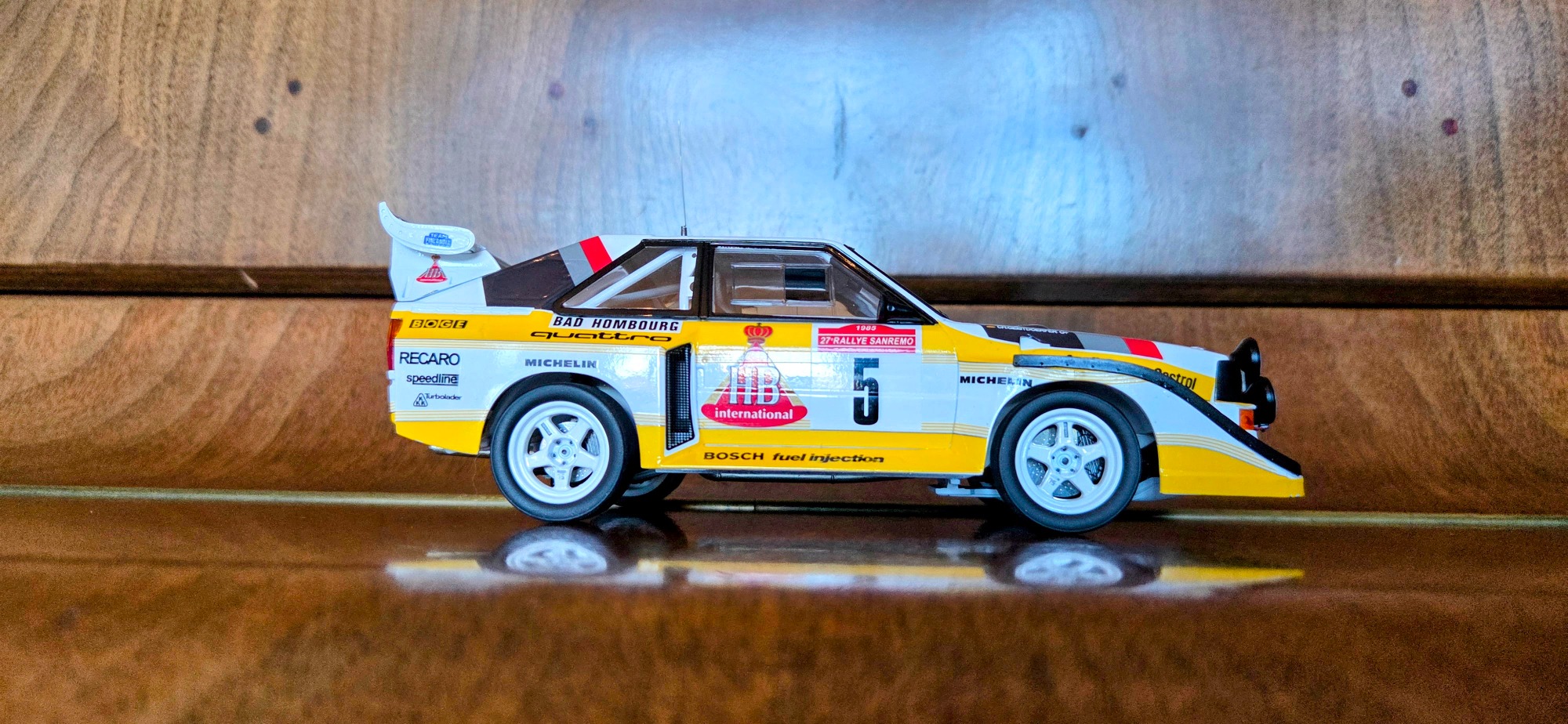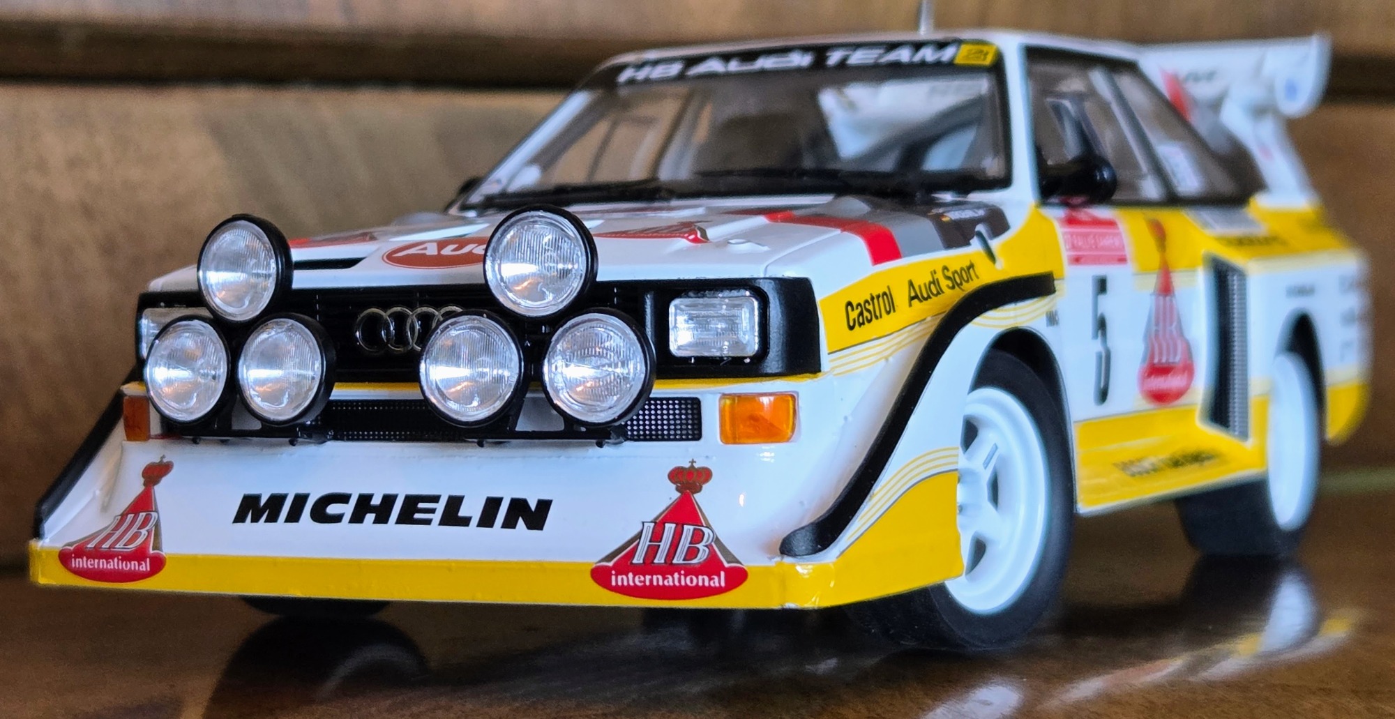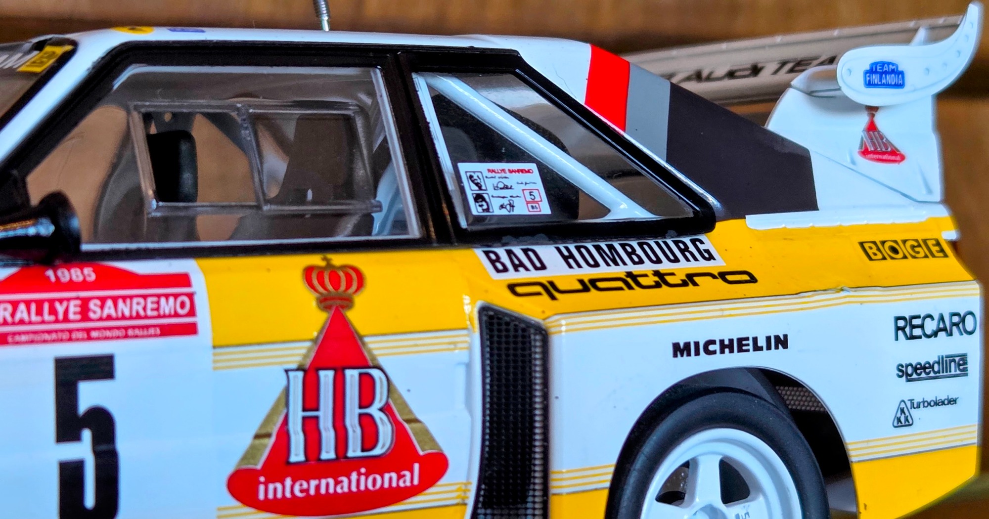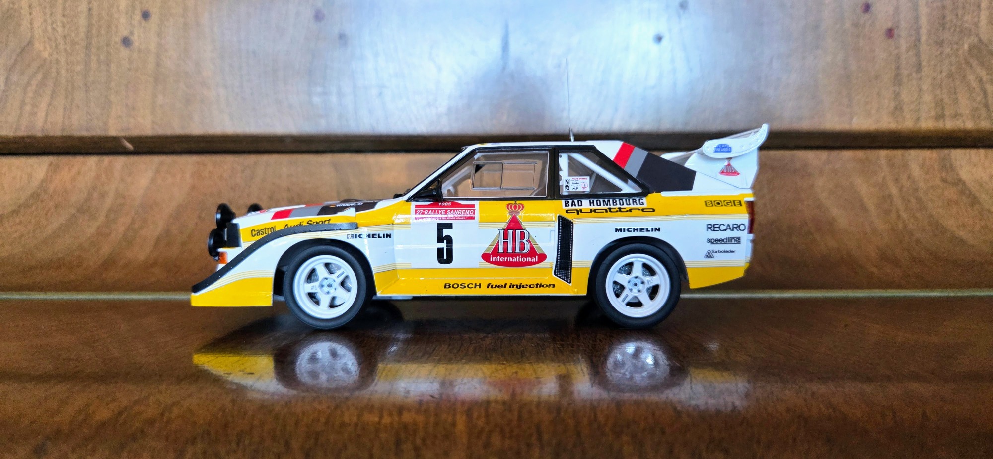Driven by Walter Röhrl and Christian Geistdörfer as car No. 5 on the 1985 Rallye Sanremo, this finished 1/24 scale build represents the Audi Sport quattro S1 E2 in its late-Group B specification. The model has been enhanced with an additional photo-etched detail set to sharpen exterior and cockpit definition beyond the standard kit.