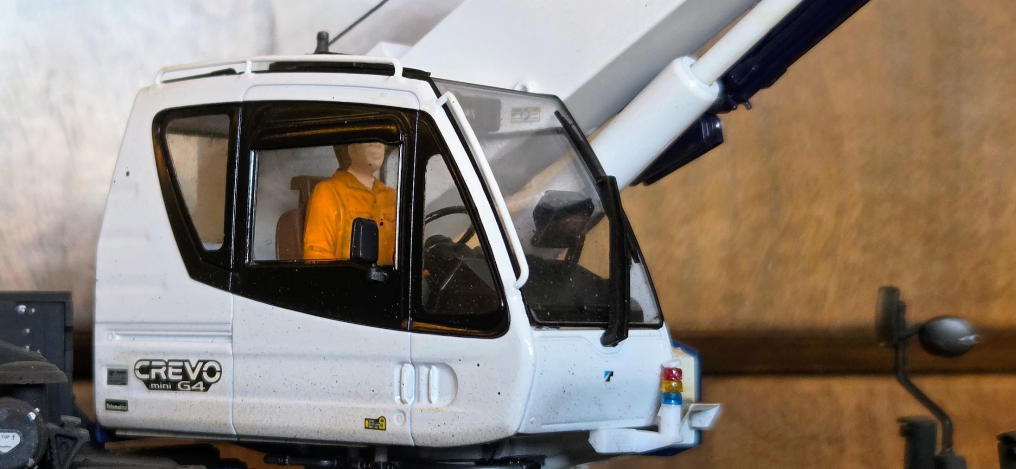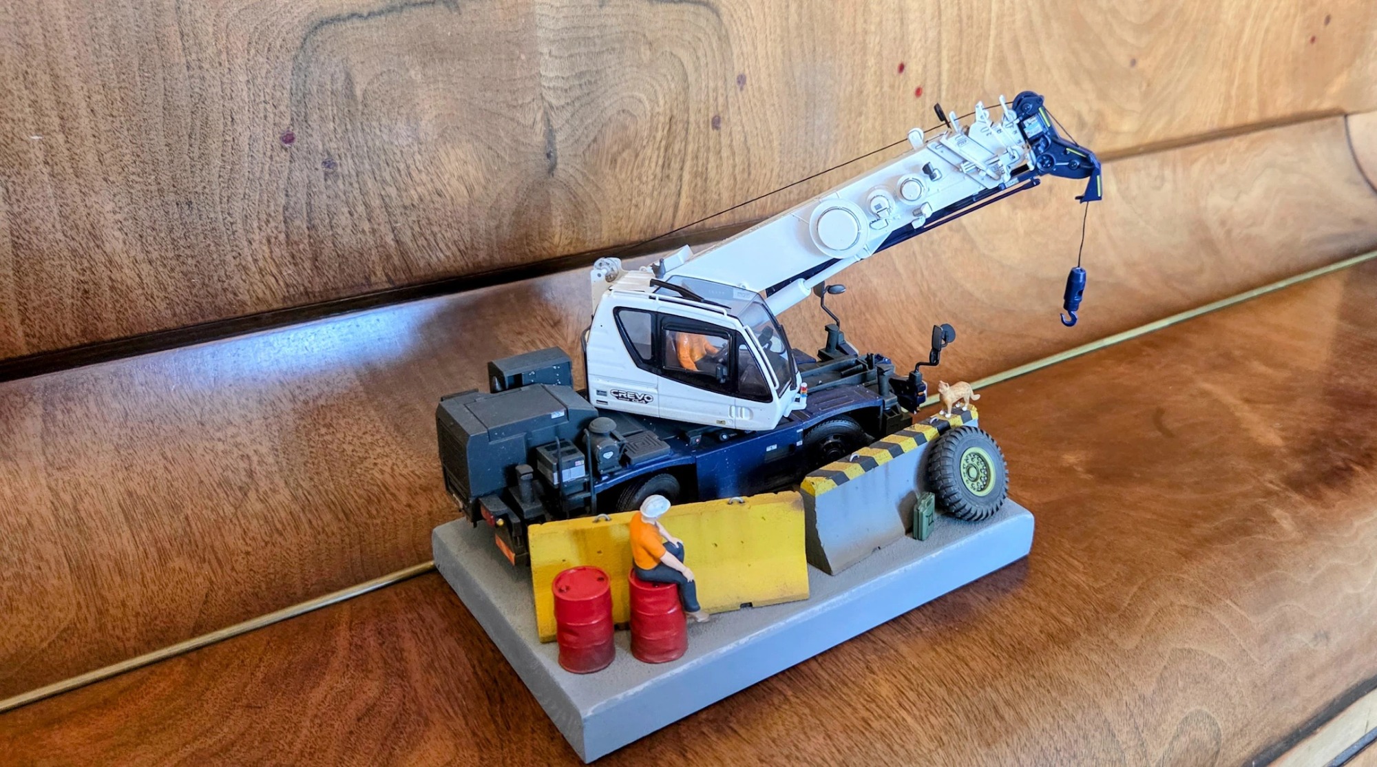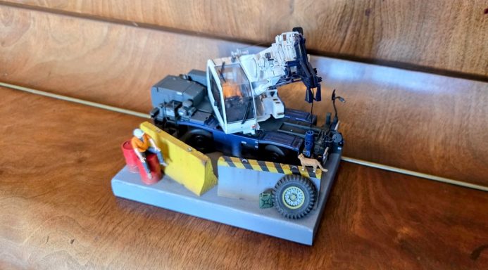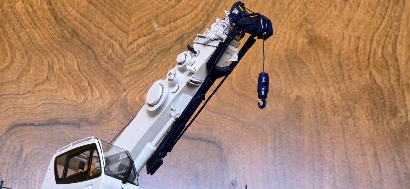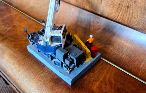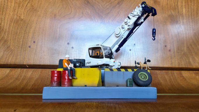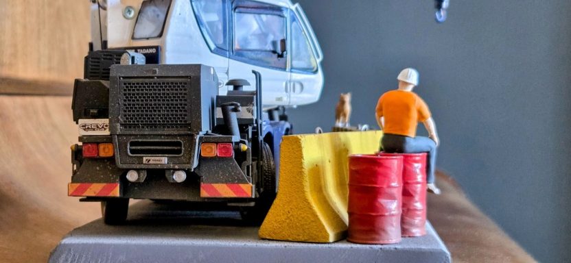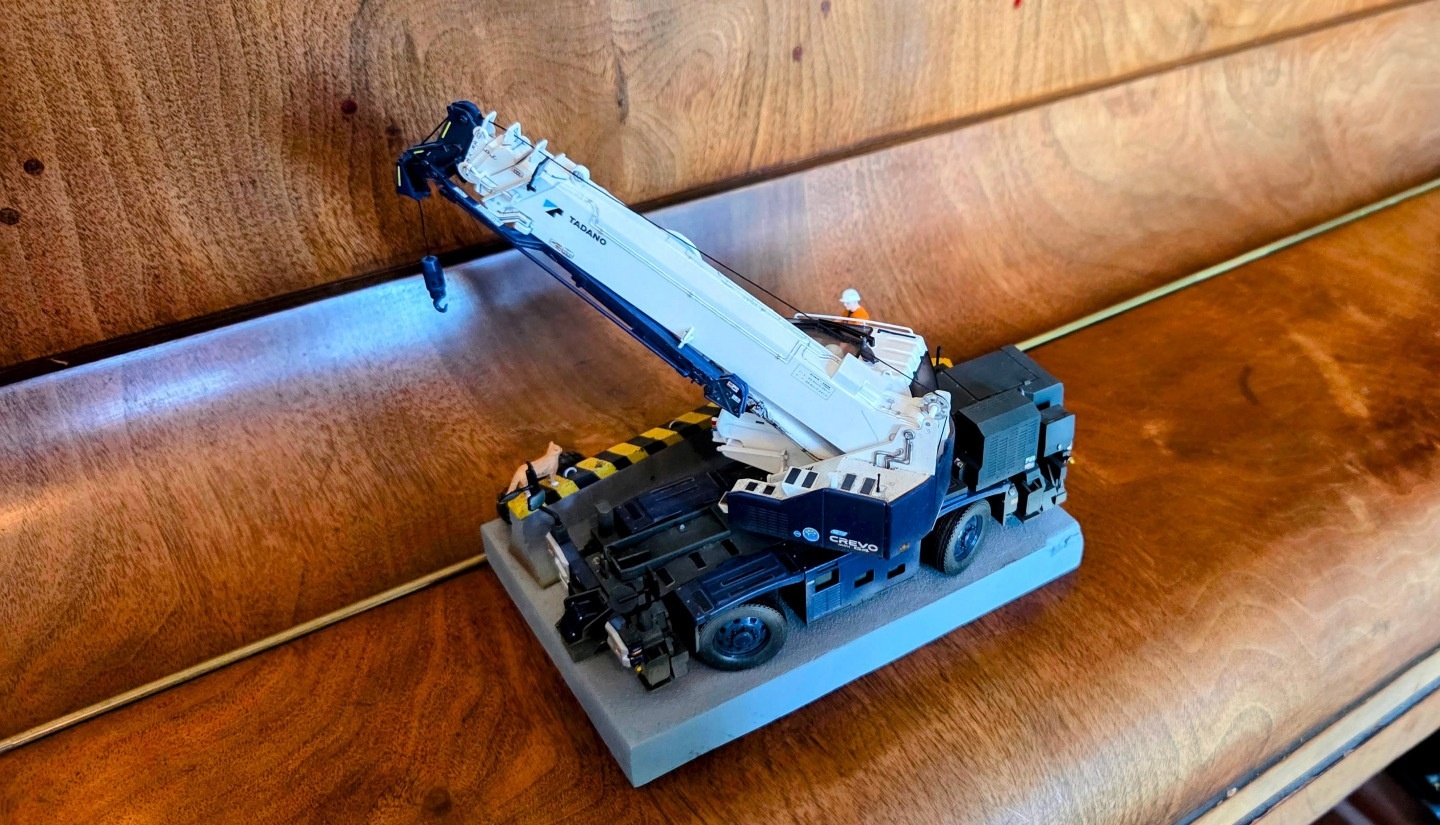 This diorama is centred on the Tadano Crevo Mini G4 rough-terrain crane, presented in a realistic working configuration rather than a posed display. The crane is finished to reflect an in-service appearance, with attention given to correct proportions, functional details, and a restrained, believable finish consistent with light site use.