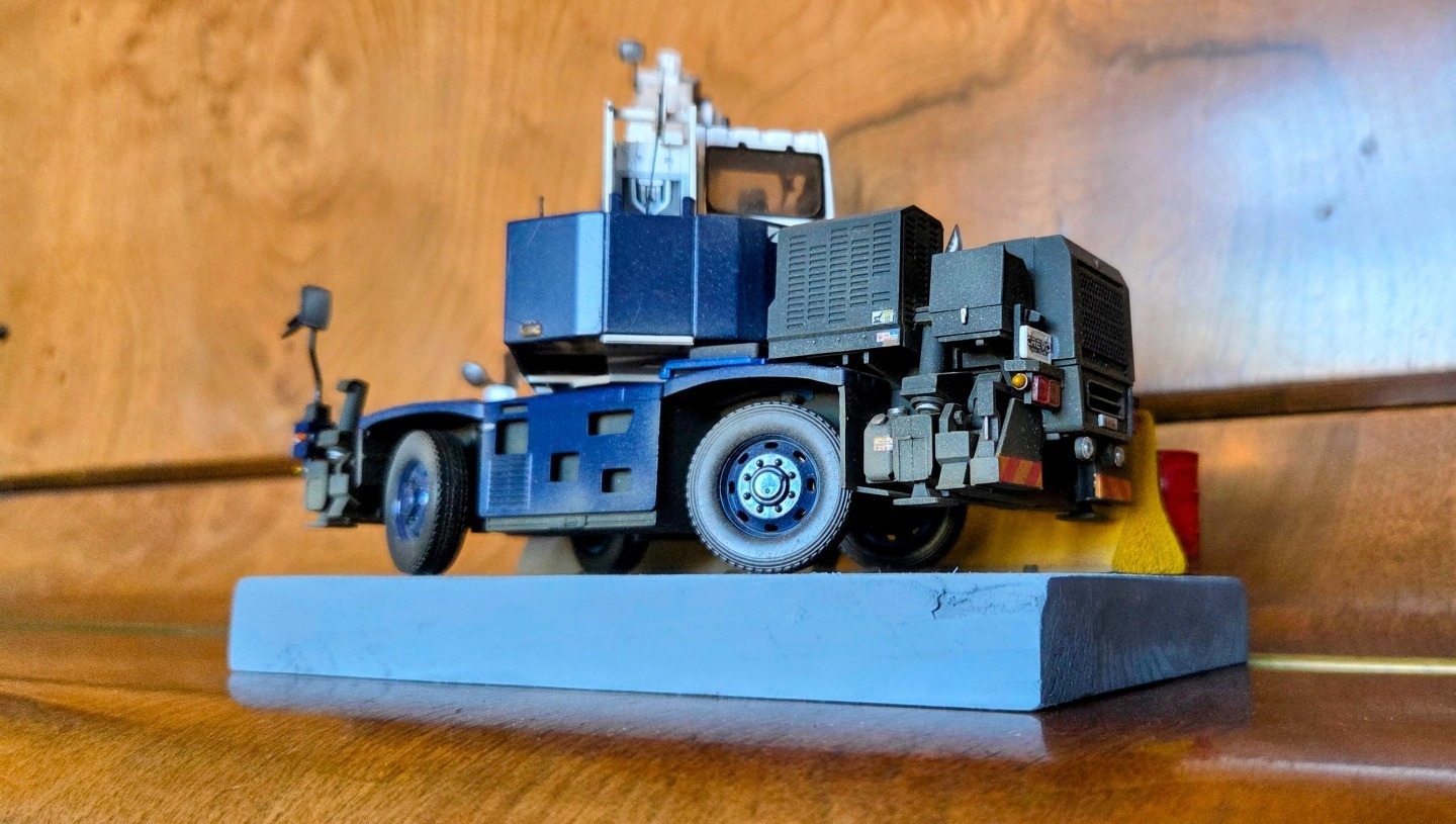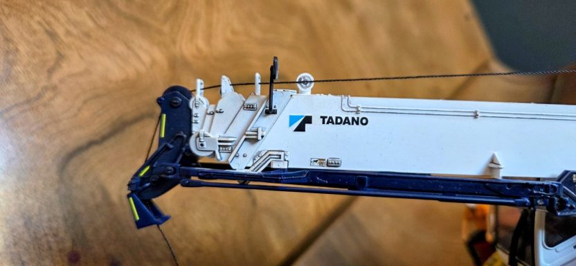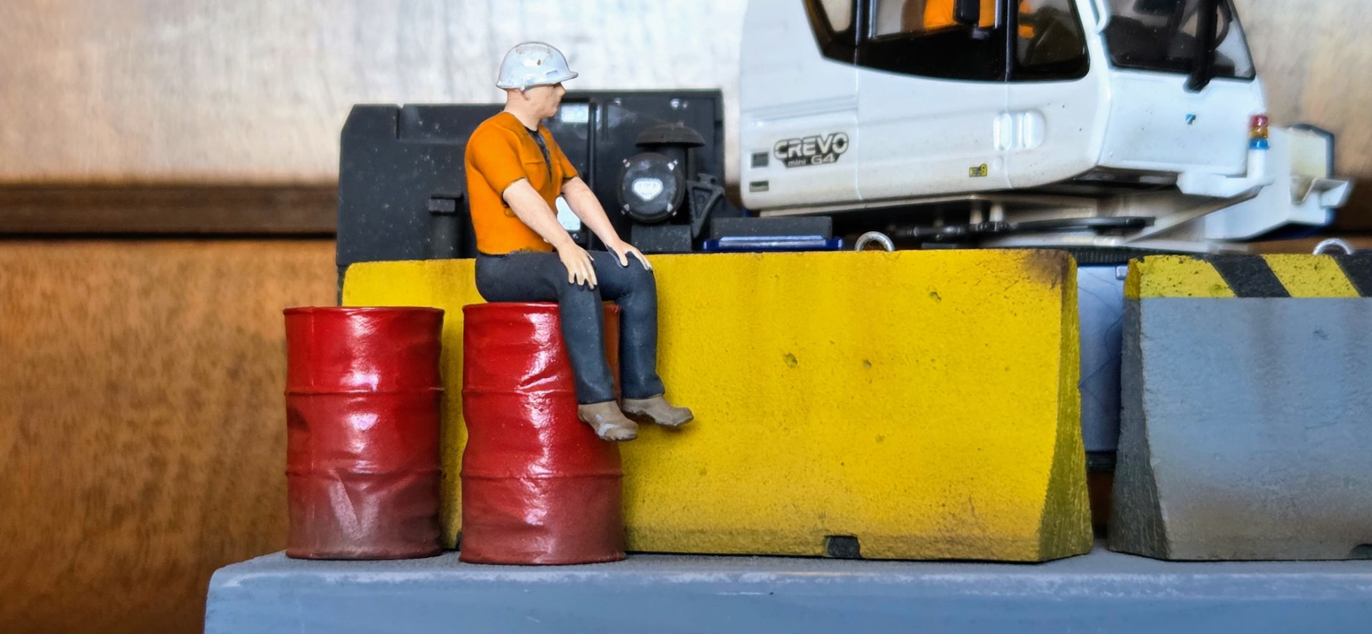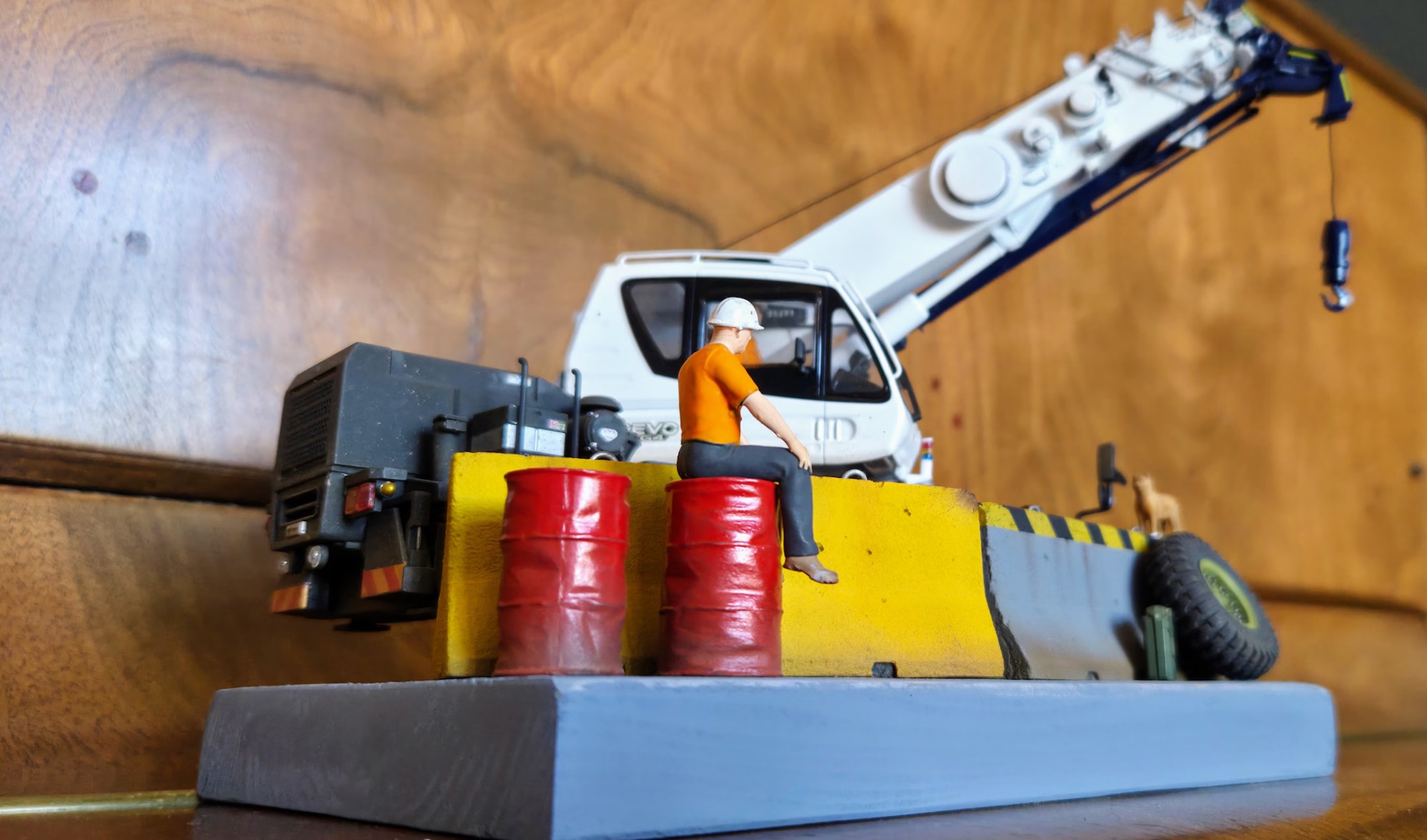 This diorama is centred on the Tadano Crevo Mini G4 rough-terrain crane, presented in a realistic working configuration rather than a posed display. The crane is finished to reflect an in-service appearance, with attention given to correct proportions, functional details, and a restrained, believable finish consistent with light site use.